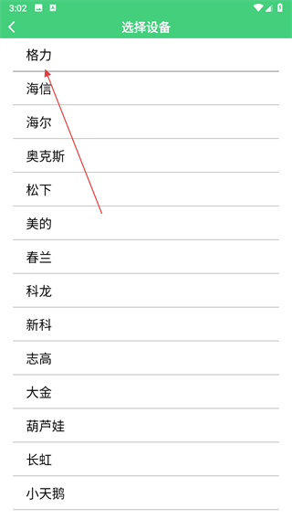 3、进入选择设备页面后,选择空调品牌,点击进入遥控页。