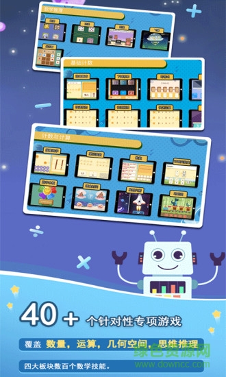 火星数学涵盖了3-8岁儿童数学教育的所有基础知识,40+个针对性专项游戏,覆盖数量,运算,几何空间,思维推理四大板块数百个数学技能