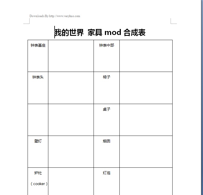 我的世界家具MOD合成表是我的世界游戏的家具合成介绍,为游戏增加了许多真实家具的mod。有些人不知道怎么合成的可以参考一下,随着版本的更新可能会有公式更改,下载这个还是很有用的。这是一个Word版文档,需要用office2003或wps打开。