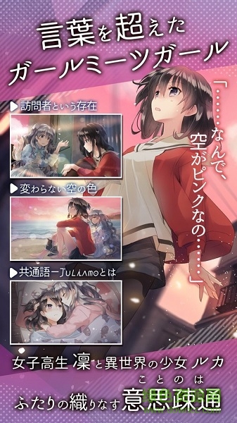 这是一款日系剧情手游,讲述了女主穿越到了一个只讲世界语的国度,并在此邂逅了一位少女,通过不断学习对方的语言来展开交流。剧情大概就是一个JK穿越到了一个异世界,这里虽然跟她原本的世界很像,但官方语言和文字都变成了世界语,在语言不通求助无门的情况下被一个14岁的萝莉收养了的故事!