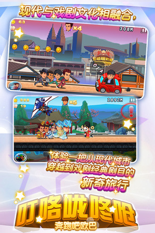 叮咯咙咚呛:奔跑吧欧巴结合喜剧元素的跑酷游戏同名跑酷手游原汁原味展现三种戏曲元素,三套戏剧配套场景可供选择,15套戏服换装丰富多彩,游戏中可解救被困同伴,体现团结友爱的团体精神,是国内首款多明星收集型跑酷游戏,火爆登录安卓系统。