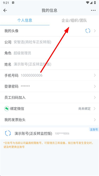 2、在我的信息界面,点击企业/组织/团队选项,进入企业相关界面。