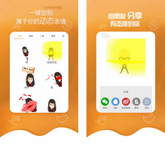 模样(iMooYoung)是一款个性化定制微信、QQ等聊天表情的APP,通过简单的操作,可以定制非常萌的人物形象,并一键制作各种动画表情。