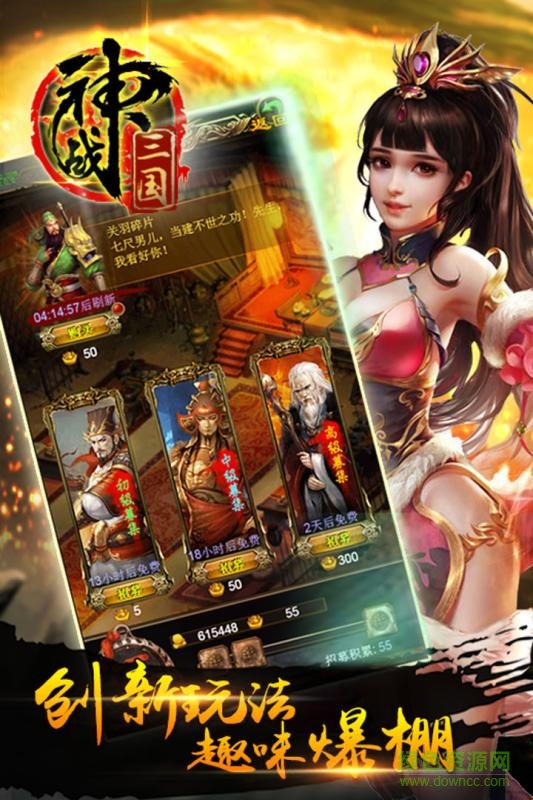神战三国变态版游戏带你走进全新的三国游戏世界,在这款三国题材手游中,你可以自由的选择自己的阵营来进行战斗,挑选你最爱的武将们,招募培养他们作为你自己的主力,一起去征战三国吧,感兴趣的小伙伴下载试试看吧!