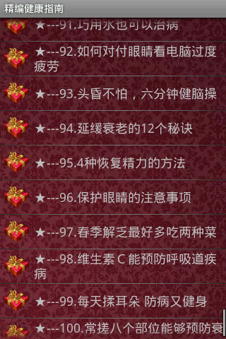 分门别类整理出约10万字的健康生活知识,涉及到健康生活的方方面面。可以说你所需要的知识,这里都有。不同于一般的电子书,“精编健康指南”采用目录列表的方式,非常便于查找和检索。“精编健康指南”将成为你健康生活的好伴侣