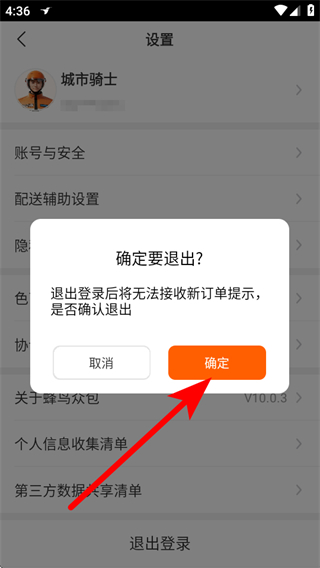 4、在提示框中点击确定,完成蜂鸟众包账号退出登录操作。