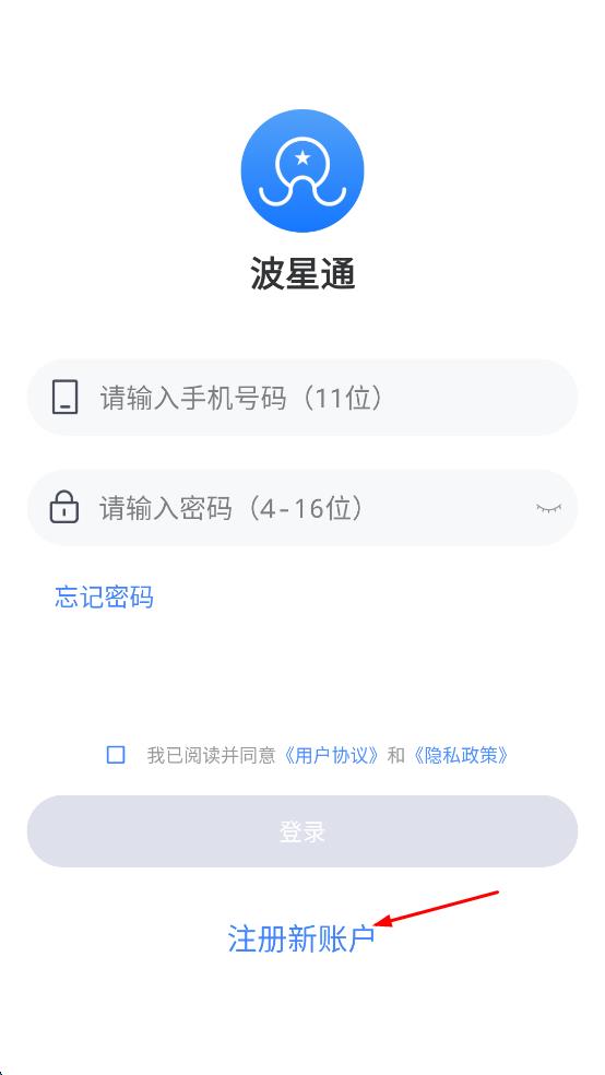 1、打开波星通APP,在登录页面点击下方“注册新账户”选项。