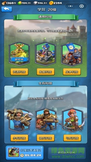 士兵科技也分三大分支,步兵科技、骑兵科技和弓兵科技,分别对三种类型的士兵进行攻击、防御、暴击、韧性等全属性的提升,提高军队战斗力,让战斗变得更简单。