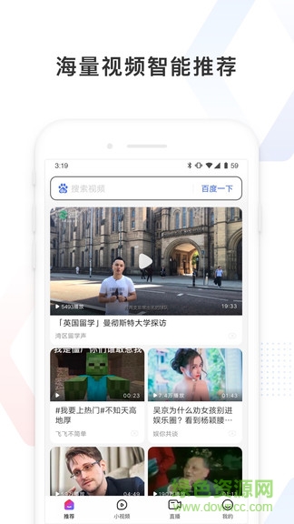 百度看看App是一个定位是分享人生、探索世界的综合视频推荐和视频搜索平台。本软件具有强大的百度搜索引擎,一站搜索全网,领先的智能技术可以快速识别你的需求,帮你找到想要的内容;覆盖了当下主流的短视频、直播等视频功能,还兼有常用的视频播放功能。