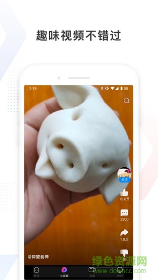 3.在小视频页面,呈现的是短视频内容,与常见的短视频观看模式一样,上下滑动即可更新新的短视频内容,除此外,用户还可以对该视频的作者进行关注,对视频内容进行点赞、评论、转发,同样是为了帮助用户匹配更加适合的视频内容,在每个短视频内容的界面都设有一个“踩”的功能按钮,用户点击后,会减少对该类型视频内容的推荐。同样,在短视频页面的右上方也设有搜索功能。