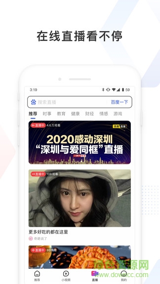 2.在百度看看中,其搜索有别于大家常用的“百度一下”,百度看看的“百度一下”,主要是对视频内容的搜索,不显示图文等信息的搜索,而且搜索的类别上,只有“视频”、“小视频”和“直播”等。搜索的内容,则采用智能化的Feed流模式。