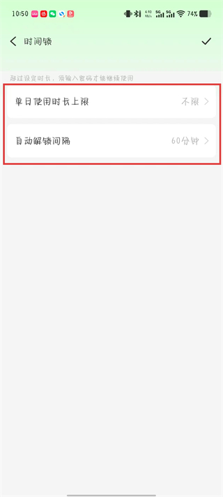 4、在时间锁设置页面,设置完成后点击对勾即可。