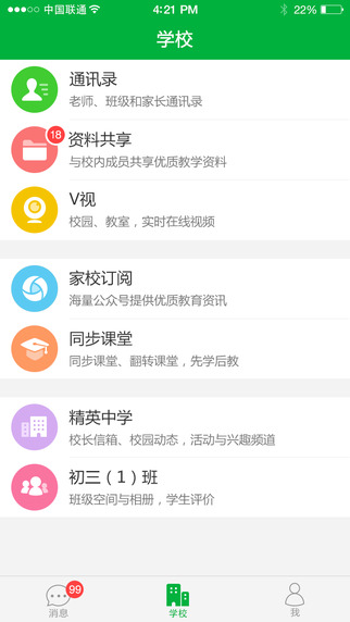 V校,把学校装进手机!一站式教育信息化服务平台:面向学校老师的教务和教学管理,面向学生家长的家校互动与成长管理,面向社会公众的智能门户。V校,支持支持iOS随时随地,简便快捷!V校,技术创新教育!V校,致力于成为老师教学的好帮手!家长沟通的好助手!学生学习的好伴侣!学校教务的好平台!教育管理的好顾问!