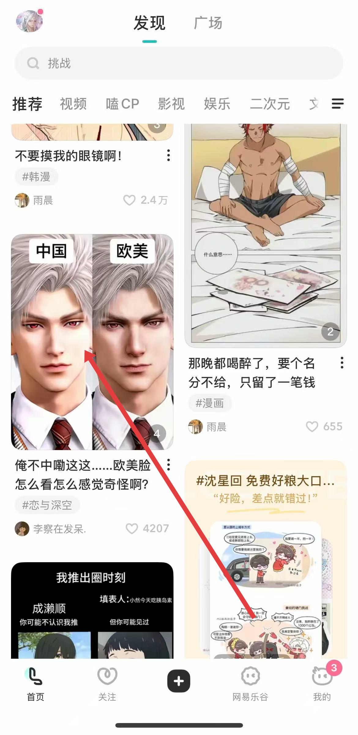 1、打开老福特APP,进入发现页面,浏览推荐、视频、嗑CP等各类板块,这里有丰富的内容。