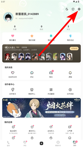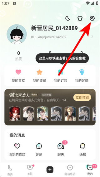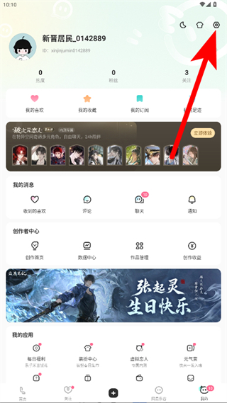 2、在个人页面中点击右上角设置图标,进入设置页面。