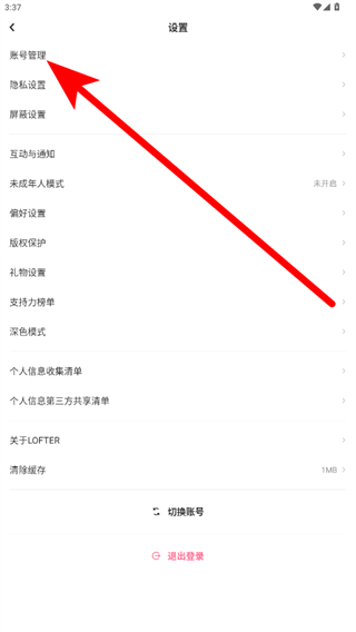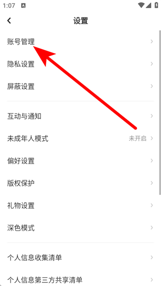3、在设置界面里,点击账号管理选项,进入账号管理页面。