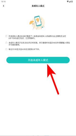 4、在未成年人模式页面点击开启未成年人模式,即可开启老福特的青少年模式。