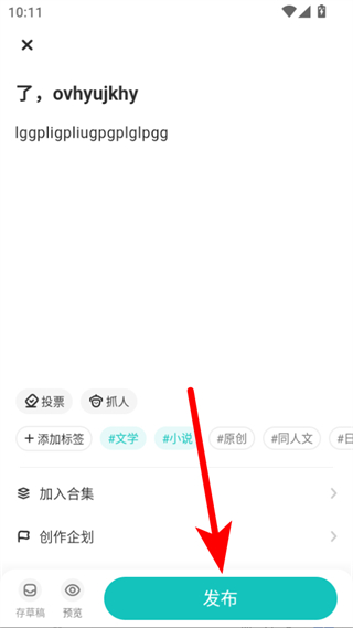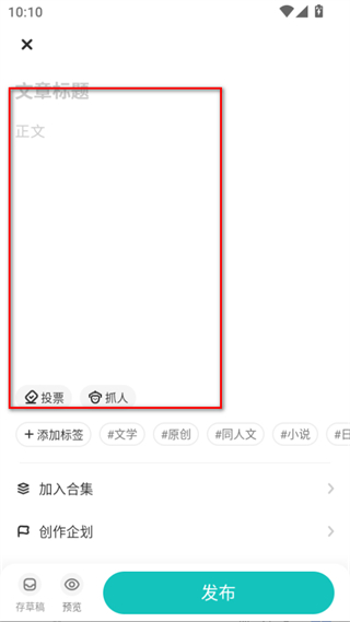 3、在文字作品编辑页面,输入文章标题和正文内容,还可添加投票、抓人等互动功能,以及选择相关标签。