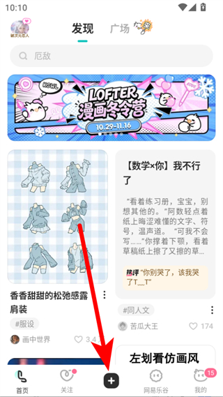 1、打开LOFTER App,点击底部导航栏的加号按钮,进入创作选择界面。