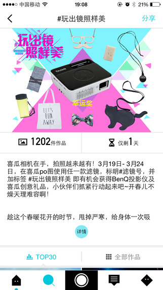喜瓜iOS版是一个以移动互联网为核心,集读图、社交、购物于一体的手机拍照分享平台。软件专注于手机拍照分享,提供顶级滤镜与专业调节。在这里,随手捕捉分享生活美好时刻,还可以拍摄15秒视频,添加超炫滤镜、主题和配乐。让影像更美,毫不费力。欢迎大家前来下载!
