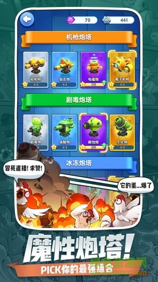 2)、合并升级炮塔,有策略的搭配各类炮塔,抵抗不同的敌人。