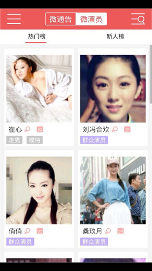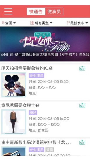 中国最大的演艺圈招聘平台,数万通告海量演员任你选择!当演员,做模特,参加商演活动,体验剧组生活,交往明星朋友!所有通告一网打尽!附近演员一览无遗! 微星辰,让每个人都能演戏!不管你是演员、模特、歌手、舞者还是想兼职参加节目当群演的酱油帝,不管你是职业导演、经纪公司、商演公司还是只想拍部短片的未来之星,微星辰,帮你找人找通告,让每个人都能演戏,给你想要的一切。