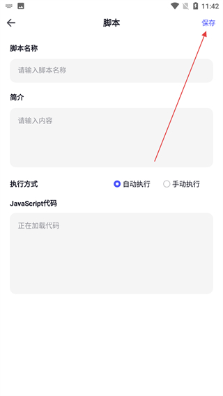 5、填写脚本名称、简介,选择执行方式并输入代码后,点击保存。