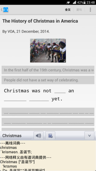 5.独创的逐句学习模式,您可以一句一句的学习听力,每个单词即点即显,即点即译,免去长按选词的麻烦,手动打开关闭英文中文,一句一听写并计算得分