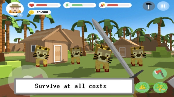 在游戏中你需要不断地收集素材来建造自己的领地,可能会碰到狮子老虎等野兽,战胜他们,生存下去!