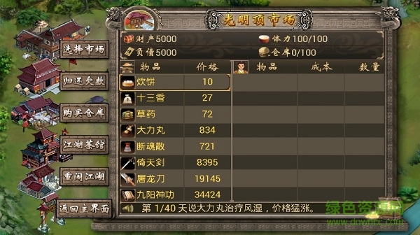 1、该游戏采用朴素精简的画风制作,主要依循“低买高卖”的经商概念进行经营,在这里你将以一个负债5000的少年身份开启40天经商生活。