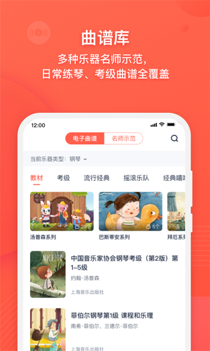 包括孩子们在学习钢琴时最常用到的曲谱教材以及各大学院的考级教材曲目均有收录,不仅能够满足孩子的日常练琴需求,还可以让孩子随时练习考级曲谱,提高考级通过率。