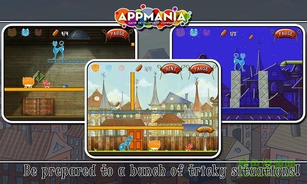 是一个非常有趣的益智游戏。游戏里有三只小猫,各自有不同的能力。矮个子小猫能通过很多障碍,高个子小猫能当踏板让其他猫跳到高台上,胖猫则能推动一些重物。