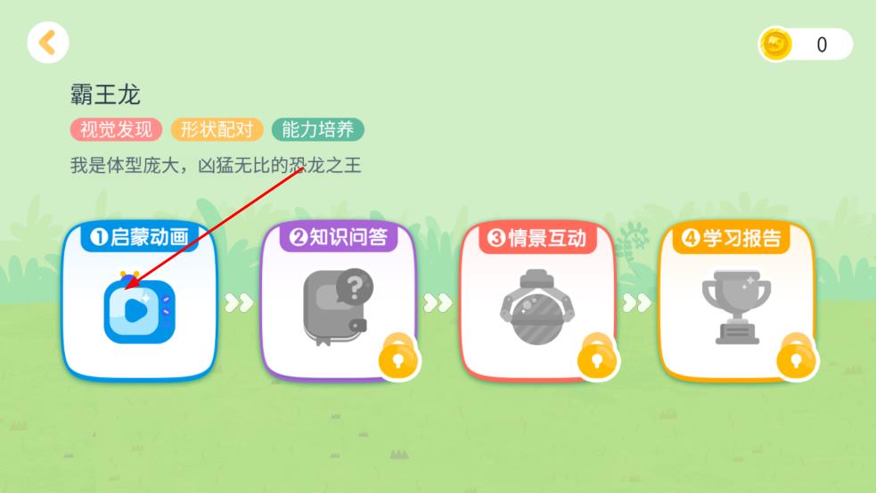3、在霸王龙课程页面,找到启蒙动画功能模块,点击该模块开始体验对应的课程内容。