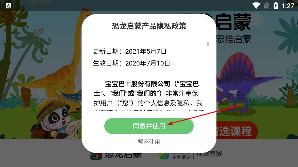 1、打开宝宝巴士恐龙启蒙APP,查看弹出的隐私政策提示,点击同意并使用按钮进入应用。
