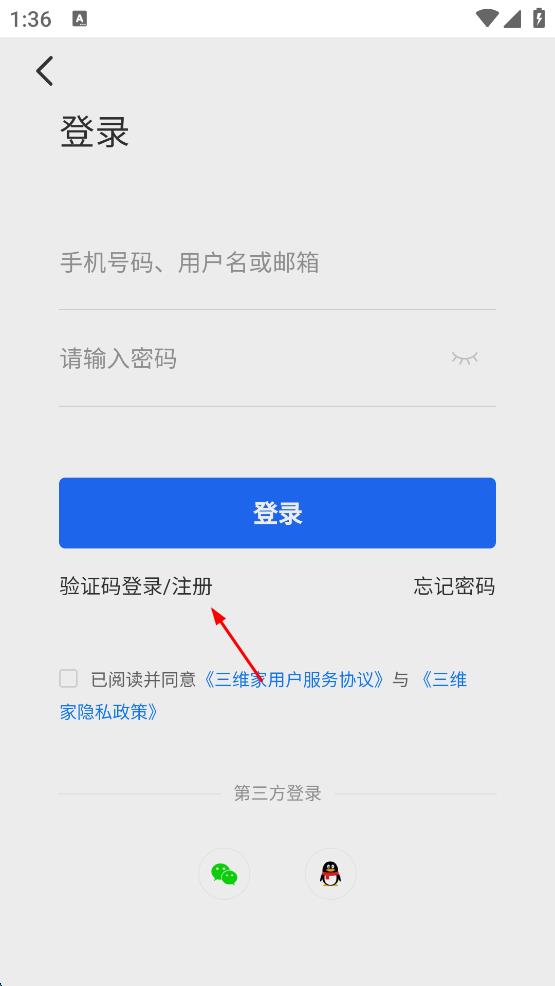 3、在登录页面点击验证码登录/注册选项,进入验证码登录页面。