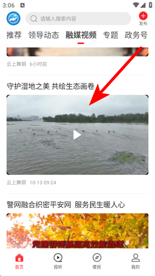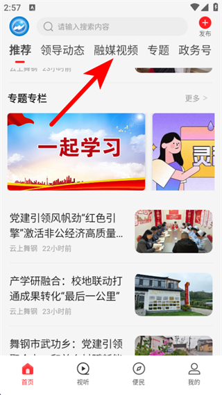 1、打开云上舞钢APP首页,点击融媒视频,进入融媒视频页面。