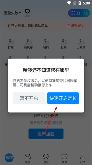 2、进入主界面后,出现定位权限提示框,可选择快速开启定位或暂不开启。