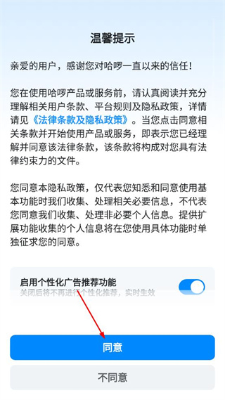1、打开哈啰,查看弹出的温馨提示,点击界面中的同意按钮以继续使用。