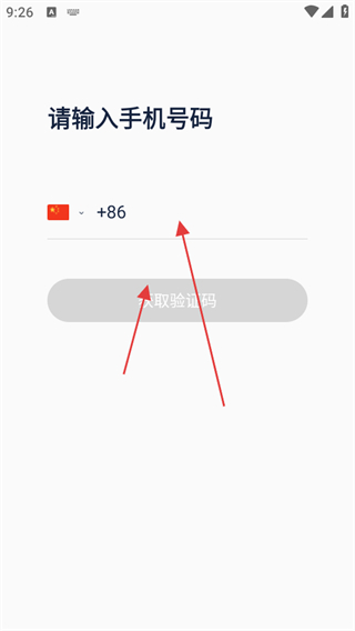 2、进入手机号码输入页面,确认国家区号无误后,填写手机号码,点击获取验证码。