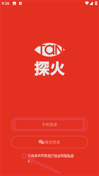 1、打开探火APP,在勾选已阅读并同意用户协议和隐私政策,点击手机登录选项。