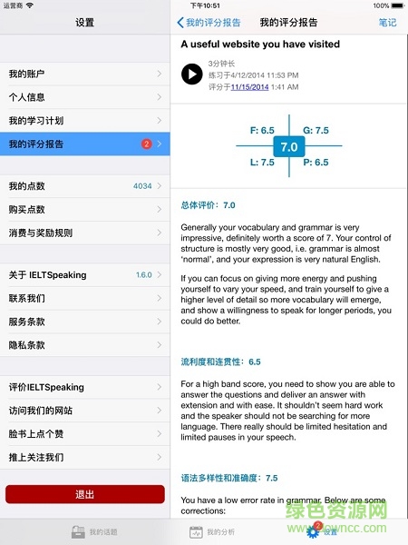 4、您还可以提交您的练习,得到我们的前雅思考官的评估打分,我们的考官会针对您的实际情况撰写一份详实的报告,来帮助您改进和提高您的口语水平。
