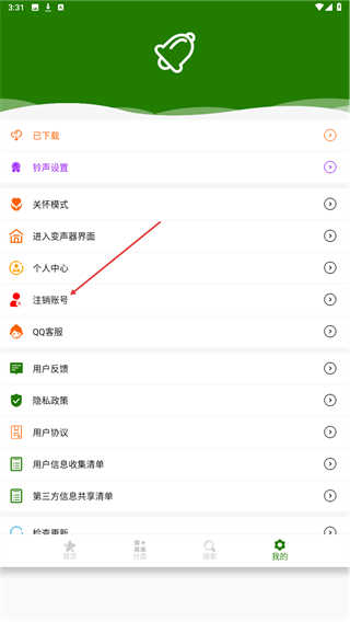 2、进入我的页面内,找到并点击下方注销账号的按钮。