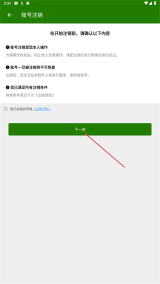 3、在账号注销的页面内,勾选已同意后点击下一步的按钮。