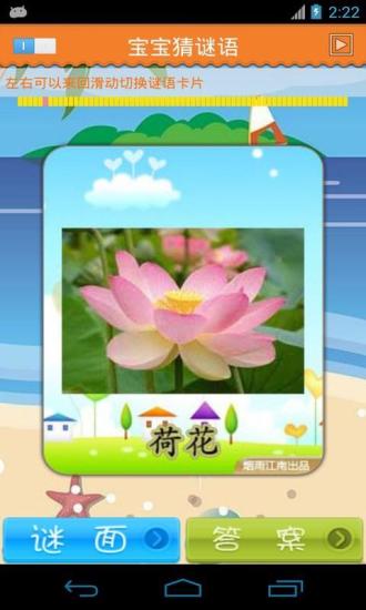 宝宝猜谜语是一款教育宝宝思维想象力的软件,通过图片的方式让宝宝对猜谜语产生兴趣,达到锻炼宝宝智力的目的。宝宝猜谜语采用图卡形式,选择的谜语贴近宝宝的生活,是宝宝在生活中常见的事物。家长要鼓励宝宝在猜谜过程中积极思考,促进宝宝的思维发展。