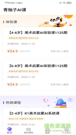 青柚子ai课安卓手机版致力于儿童美术启蒙早教服务,课程丰富多样,可以根据孩子的实际情况来选择和预约适合的课程,还可以上传孩子的得意作品,支持将画进行打印装裱,留下美好的记忆,欢迎有需要的朋友下载使用!
