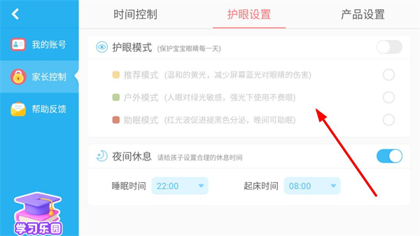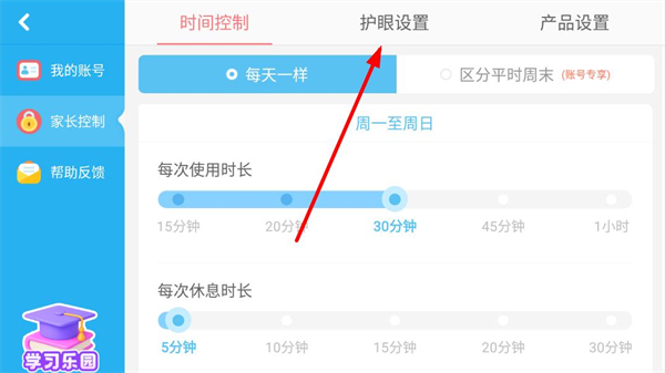 3、在家长控制设置界面中,点击护眼设置标签,进入护眼设置界面。
