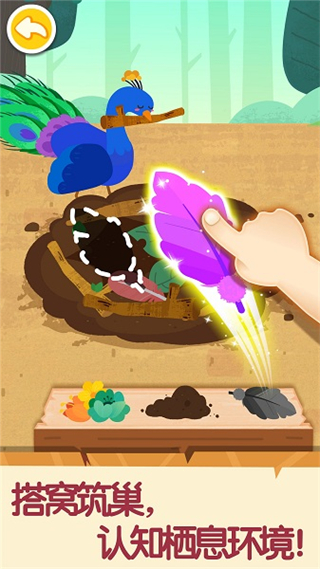 孔雀公主想住在林间草地,宝宝帮它打造舒适的家吧!先收集树枝、羽毛,用树枝拼搭出圆形的窝,接着铺满羽毛。孔雀公主的新家完成!