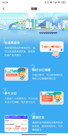 礼行团红包版最新版非常的趣味的网赚游戏软件,用户可以体验运动健身的乐趣,还有特色的养鱼赚钱玩法,非常的休闲,感受养鱼带给你的休闲时光,还有不同丰富的小游戏给你体验哦。快来下载试试吧!
