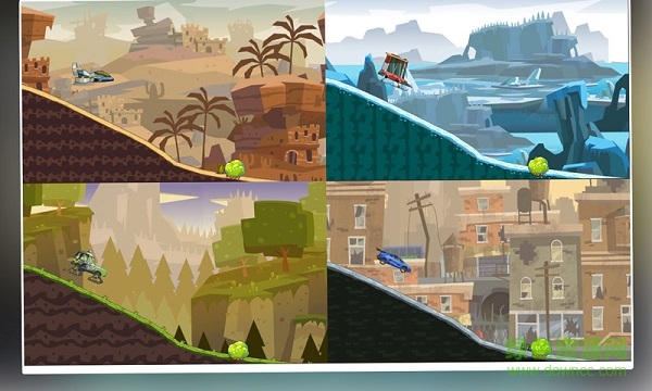 本游戏首发测试版有4个不同的游戏场景,分别是山地、雪地、沙漠和城市。山地路面以较薄的草皮为主,各种起伏较多;雪地路面积雪覆盖,整体起伏较少;沙漠路面覆盖黄沙,起伏较多;城市路面为水泥材质的公路,平缓起伏较多。