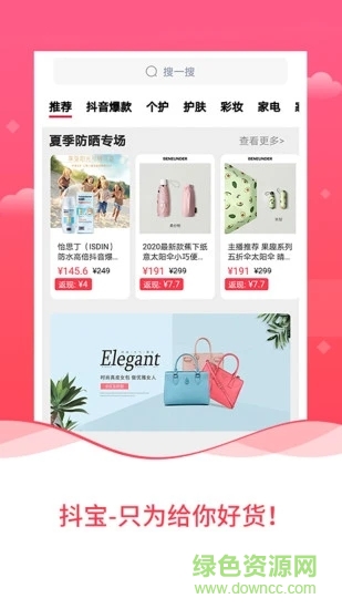 包含护肤、彩妆、家居、日用百货、餐厨、数码家电、手机电脑、个护、美食、箱包、女装女鞋、手表饰品等系列商品和服务,正品保障、七天无理由退换,全场包邮。现金红包、精选爆款就来抖一抖!